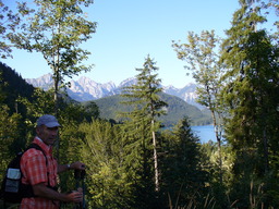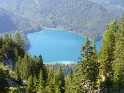 Wir umrunden den Berg und nach einem kurzen steilen Aufstieg, von dem aus wir einen wundervollen Ausblick auf den Alpsee haben, folgt der Abstieg hinunter zur Wildsulzhuette, wo sich beim Aufstieg die zwei Wege zum Saeuling getrennt haben.