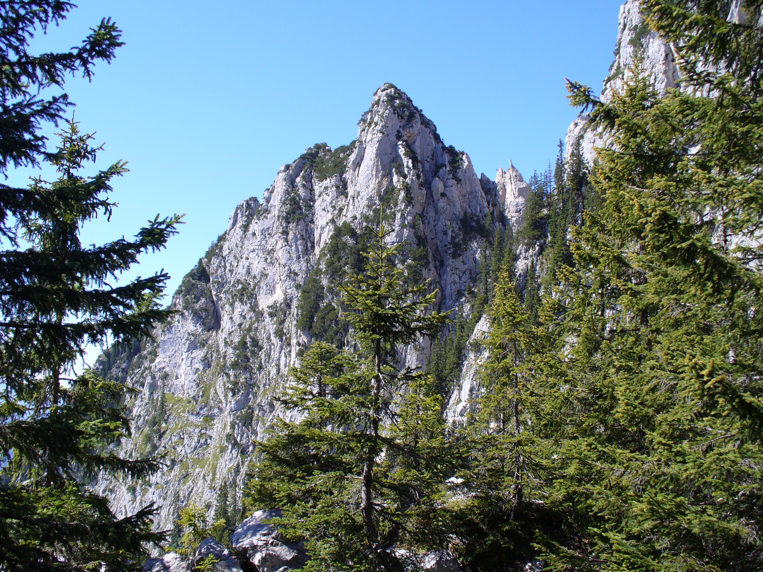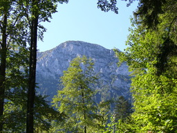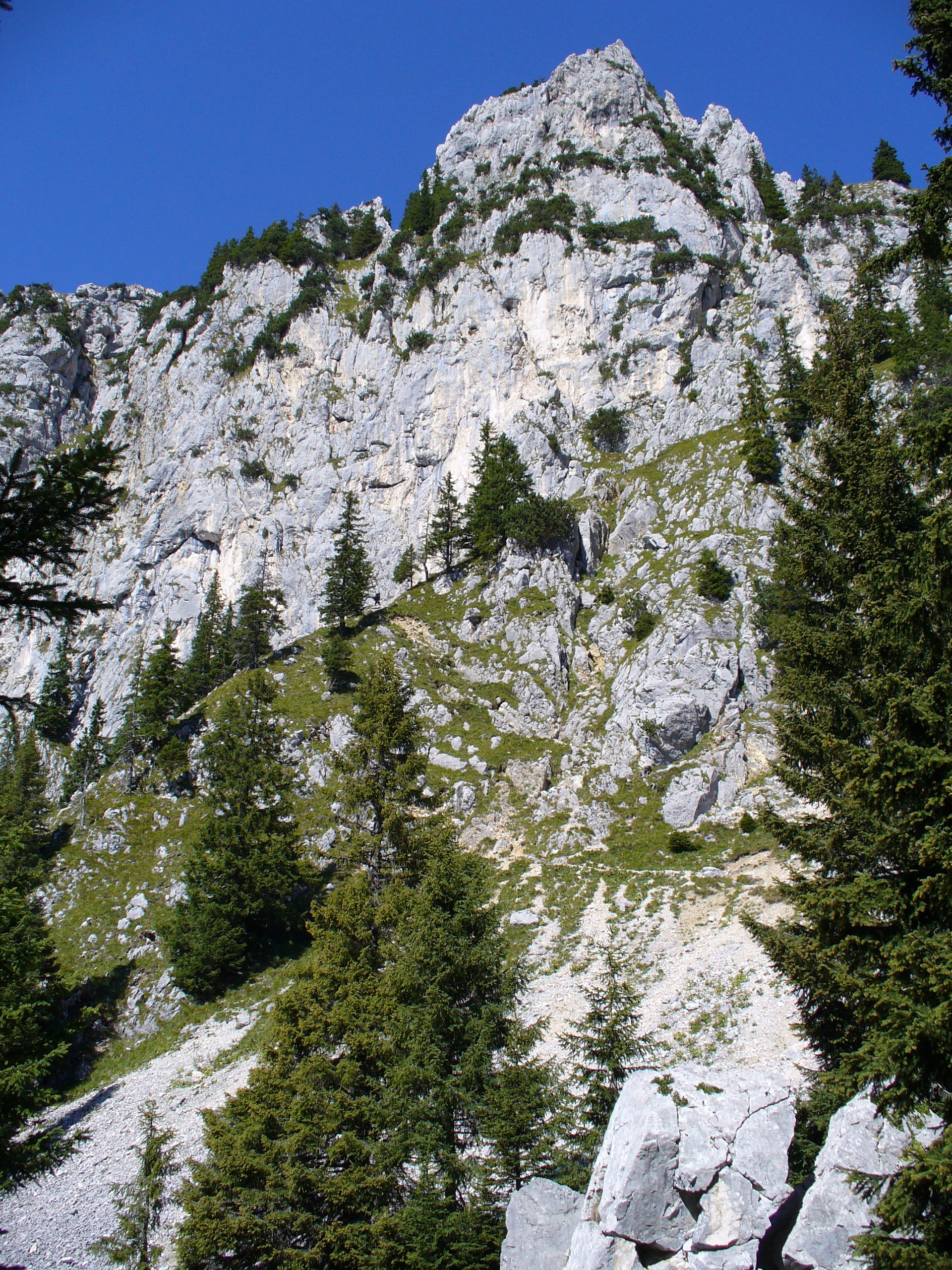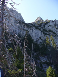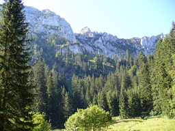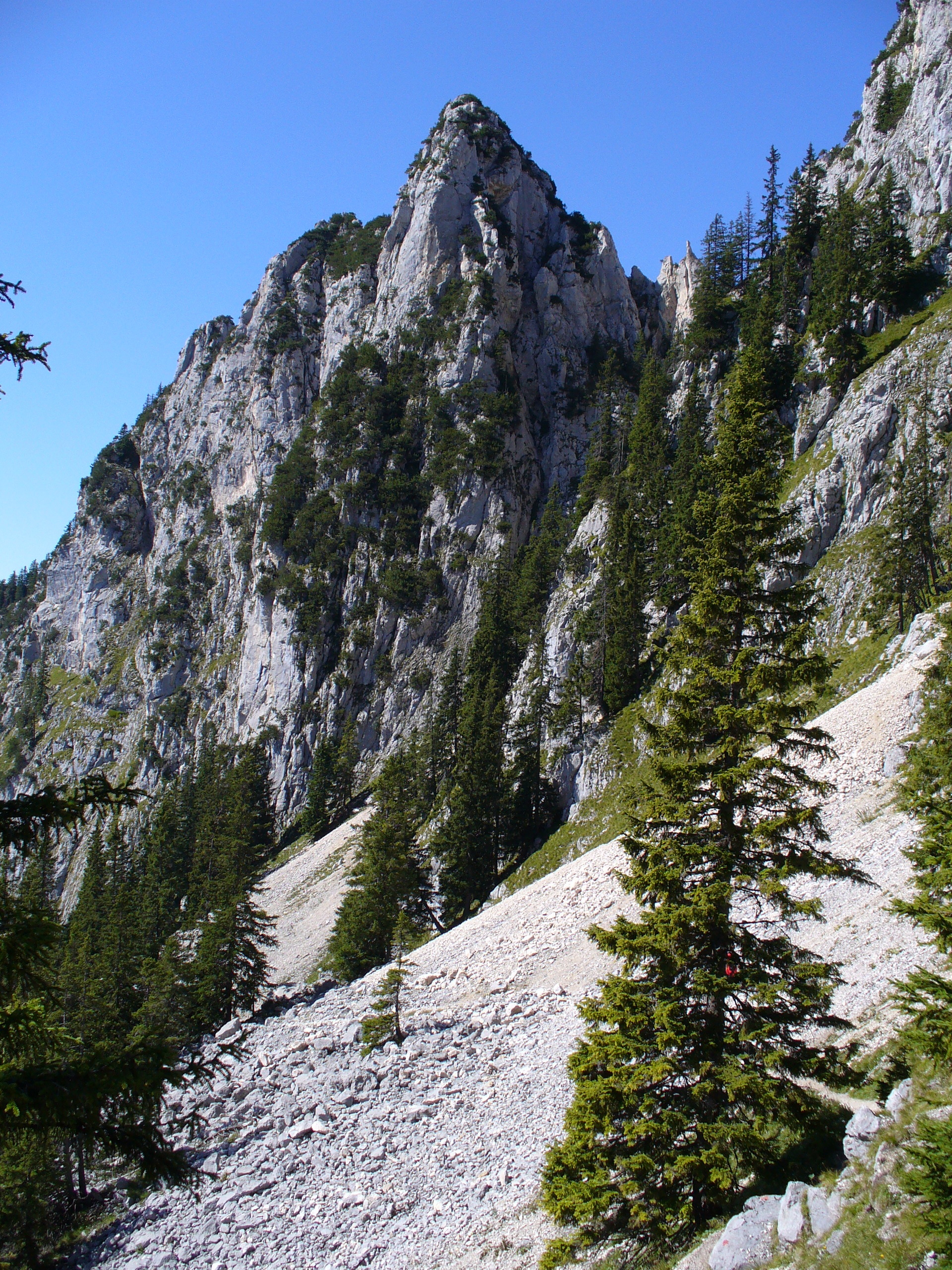 Wir queren die Nordflanke des Saeulings bis wir auf den Einstieg des Klettersteigs (eine Leiter) gelangen.